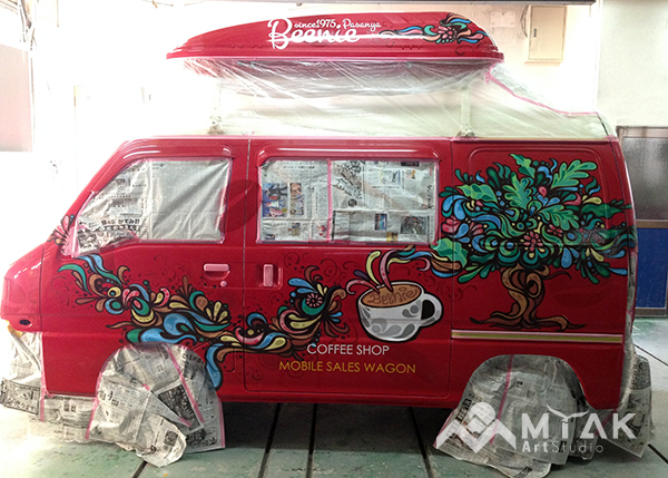 コーヒーの移動販売車”Beenie”さん。 移動販売車は年々増えてきています。 固定店も持たず、色々な場所やイベントに参加できます。 移動中にも目をとめていただくために、インパクトは重要です! コーヒーのイラストを抽象的な柄と合わせて、 カラフルで可愛い仕上がりとなりました。