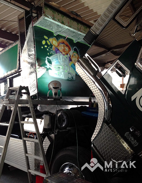 ダンプの荷台部分に商売繁盛のご利益とされる神様(恵比寿様・大黒天様) をエアブラシでペイント。イラストタッチで和やかな雰囲気となっています。 走っている時や停車している時は見れないですが、 ダンプが上がると姿を現します!ステキな演出です!
