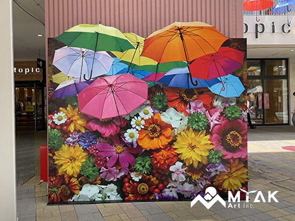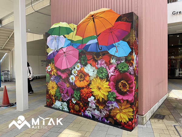 エイスクエア草津様で大人気のアンブレラ・パティオのイベントにて 大型のフォトバックを設置させていただきました。 敷き詰められた花の前に傘が浮いているデザインで、 前で手を伸ばしたりして撮影すると 一面が花の不思議な空間で傘をさしているような写真が撮れます。 デザインからパネル制作、現場の設置まで一貫して作業をさせていただけます!