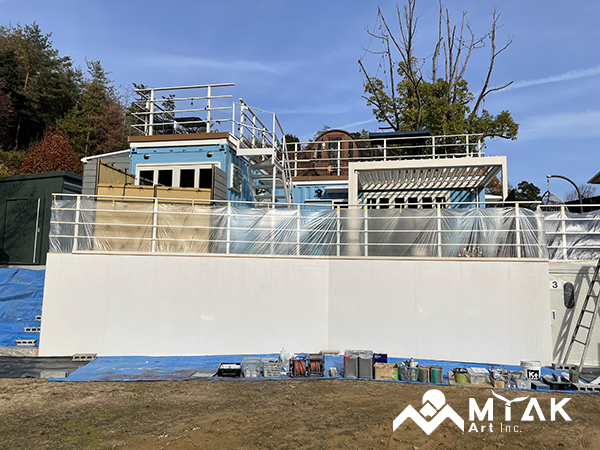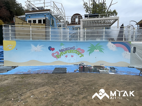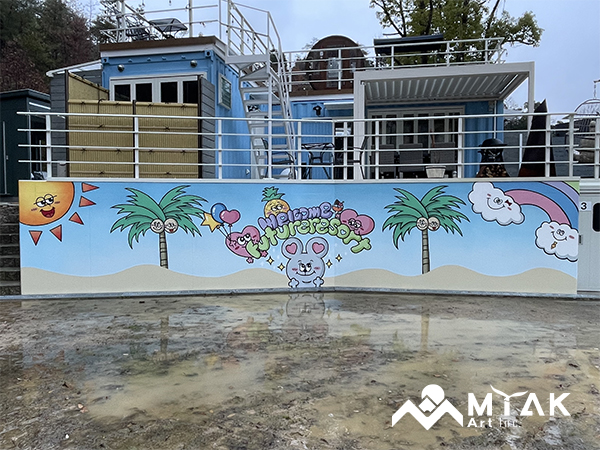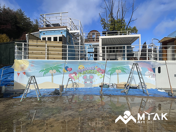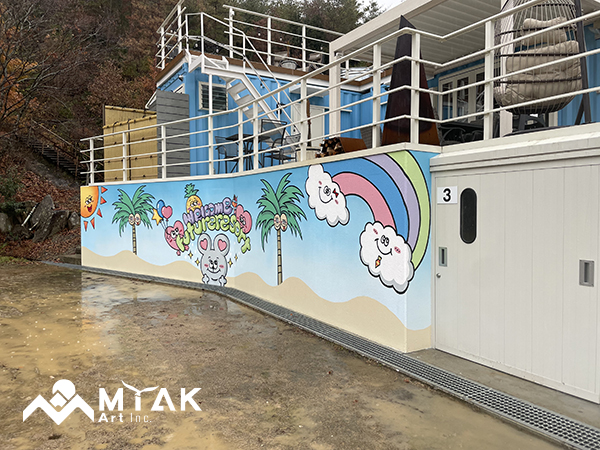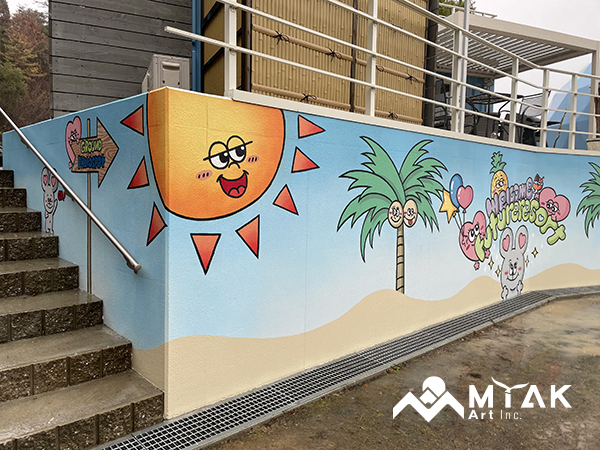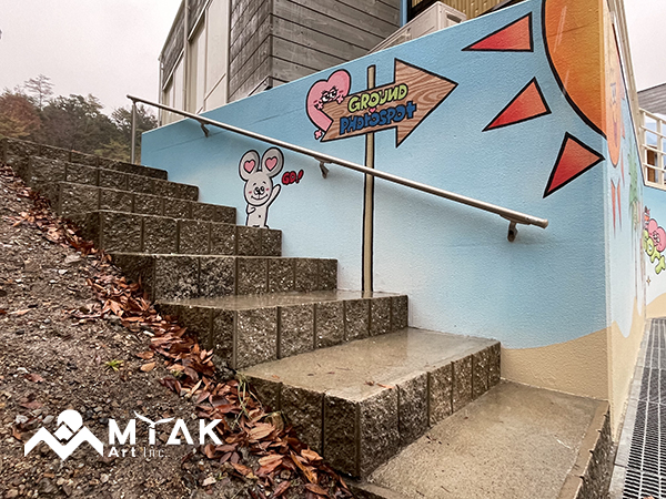 グランピング施設の壁面に壁画を描かせていただきました。 隣の階段面に続いているのがミソですね! カラフルでかわいい印象的な壁画に仕上がりました。(^ ^)