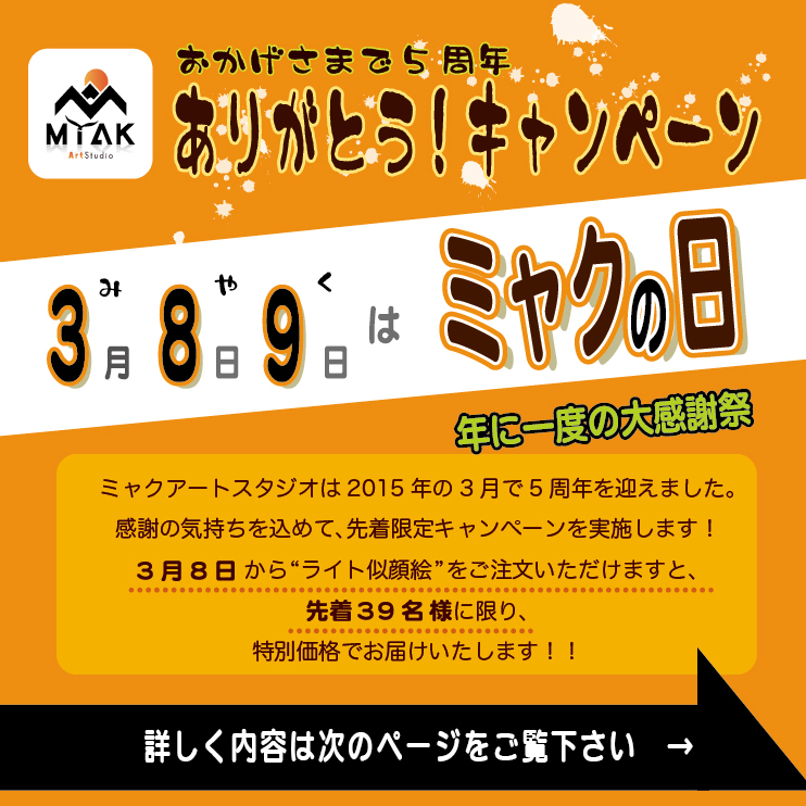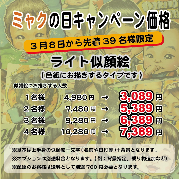 内容は3月8日からライト似顔絵をご注文のお客様は特別価格とさせて頂きます★
