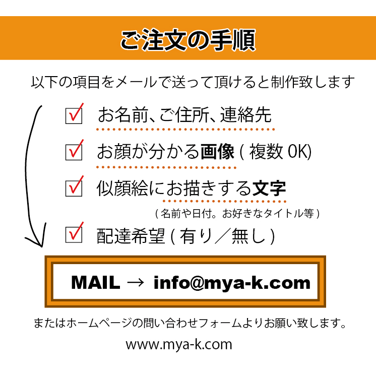 ご注文方法は、下記内容をメールで送信して頂けますと制作します。