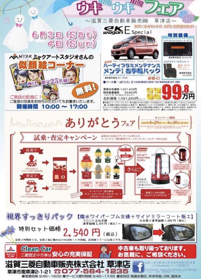 6月3、4日の土日は滋賀三菱草津店にて、似顔絵ブースを出させていただきます(^^)